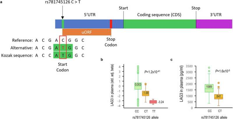 The carriers of this variant have only half the plasma LAG-3 level of non-carriers. The variant associates with a five-fold increased risk of vitiligo, but vitiligo is like thyroid dysfunction a potential side-effect of LAG-3 inhibiting drugs, which unleash immune responses to fight cancer and can have autoimmune consequences.
